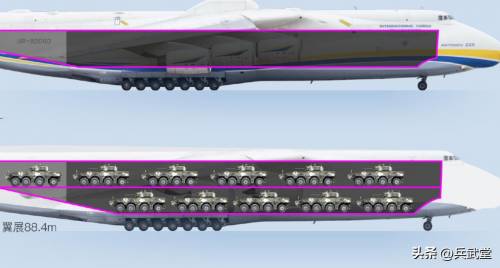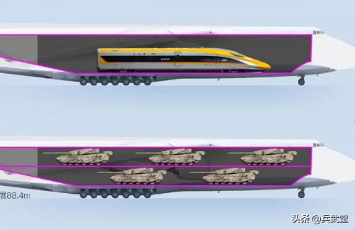 以Y-20最大起飞重量220吨,载重量66吨来看,国产新款运输机的载重量比Y-20高3-4倍,如果一旦设计出来绝对是全球最大的运输机了,堪称天花板水平。放到实际环境下,运40主货仓长度达到60,采用双层货场,可以再搭载5辆99A型重型主战坦克,或者11辆19式8×8轮式步战车,那么这是什么概念呢?