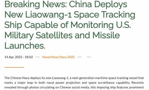 4月14日,美国“Army Recognition”网站报道了一则突发消息——“中国最新的‘t望一号’远洋测量船已经开始部署,预示着海上作战和天基军事战略结合的开始”。