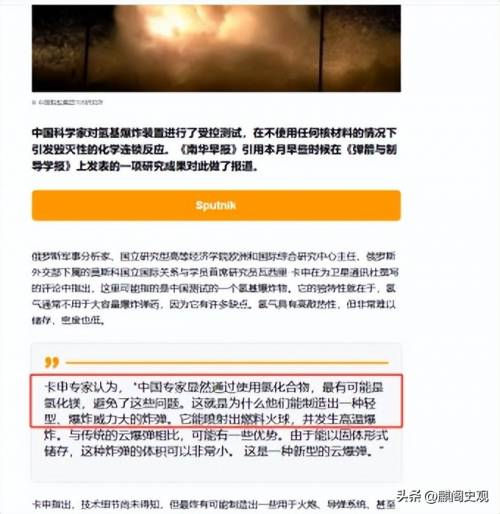 据《俄罗斯卫星通讯社》引用俄罗斯军事专家卡申报道,中国测试的“非核氢弹”属于一种“氢基爆炸物”。