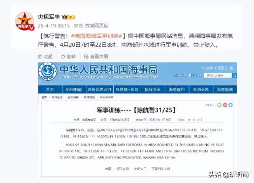 面对菲律宾和美国的不断挑衅,中方没有置之不管,而是在第一时间就进行了军事训练,从4月20日开始,解放军将在南海部分水域进行训练,为期四天,这期间不允许任何船只进入。