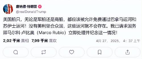 4月27日传来一则消息,中国空军去埃及的“终极目的”逐渐清晰了。这一天,美国总统特朗普在社交媒体上发文称:美国军用船只和商船,都应该免费通过巴拿马运河和苏伊士运河。同时,特朗普已向国务卿鲁比奥下令,要求立即处理这一事。