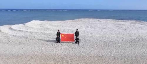 (中国海警此前在铁线礁展示国旗)