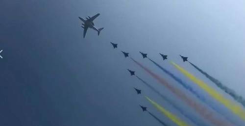 2019年10月1日,1架某型预警机预警机和8架歼10飞机组成领队机梯队,10月1日飞临天安门广场上空接受检阅。歼10战斗机拉出七道绚丽的彩烟,庆祝新中国成立70周年。
