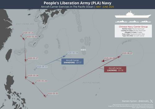 【海外军事观察家制作的双航母位置图,可以看出这两艘航母可能会在不久后会师】