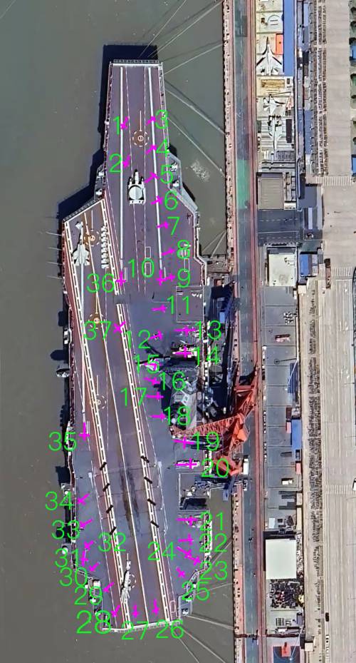 一号、二号起飞点暂停使用,只使用斜角甲板收放舰载机时,有30个可用左弹2、右弹6,1号起飞点1、起飞点后1、13个永久停机点;左侧4个不影响起飞的停机点,3号弹射器起飞点……